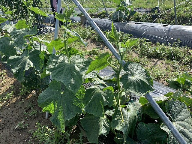 キュウリは先日の風で少し傷んでします。