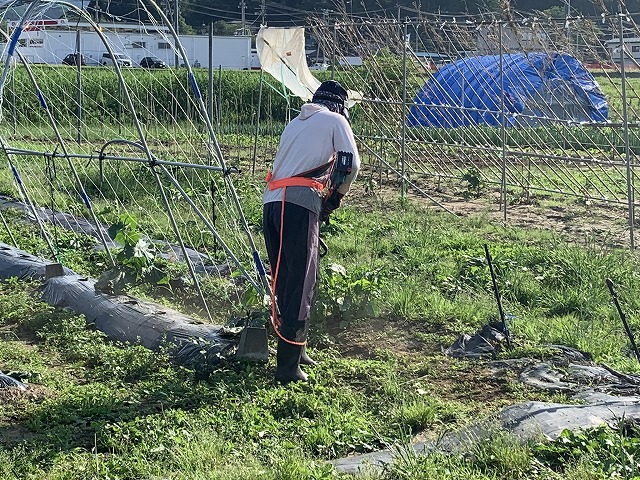 Tomはエンジン式なので畑の外側の堅い草刈り
