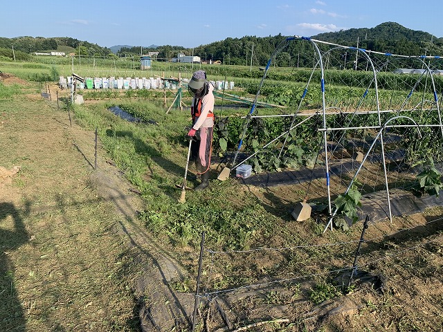 カミさんはバッテリー式なので畑の畝間の柔らかい草を中心に草刈りを行います。