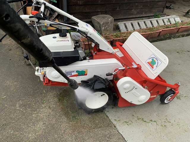 草刈りが終了した後は、ケルヒャーの高圧洗浄機でハマー君を洗浄します。