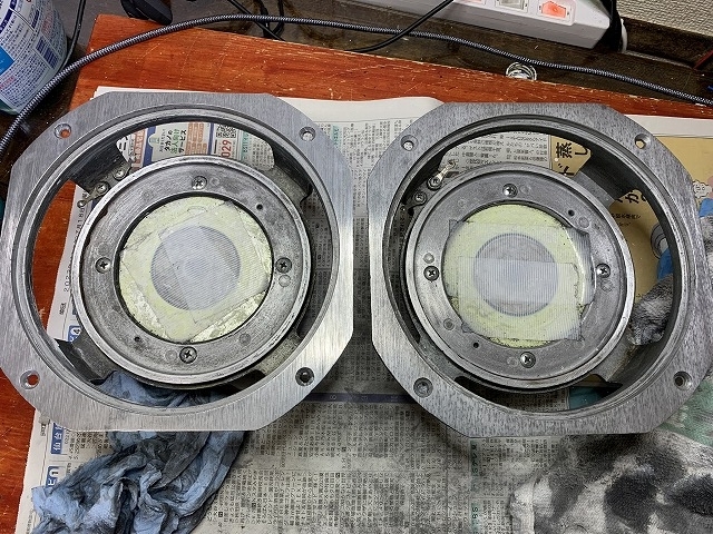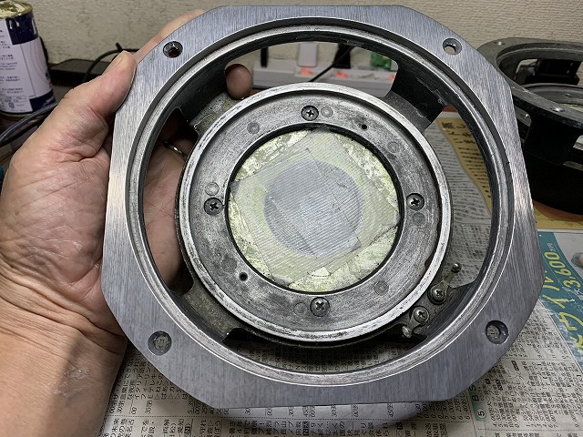 これが、コーン紙とボイスコイルを取り除き、接着剤を除去したLE-8Tのフレームです。