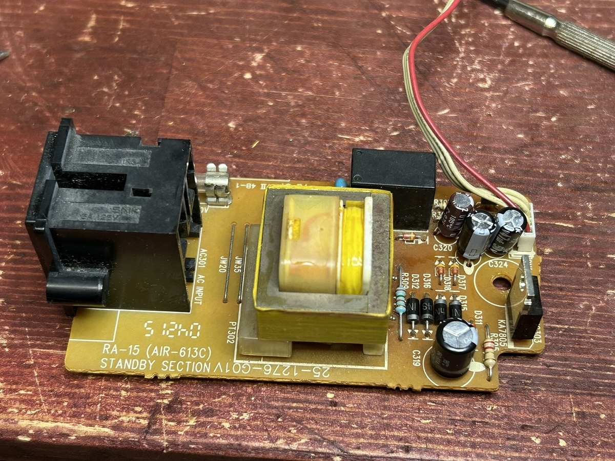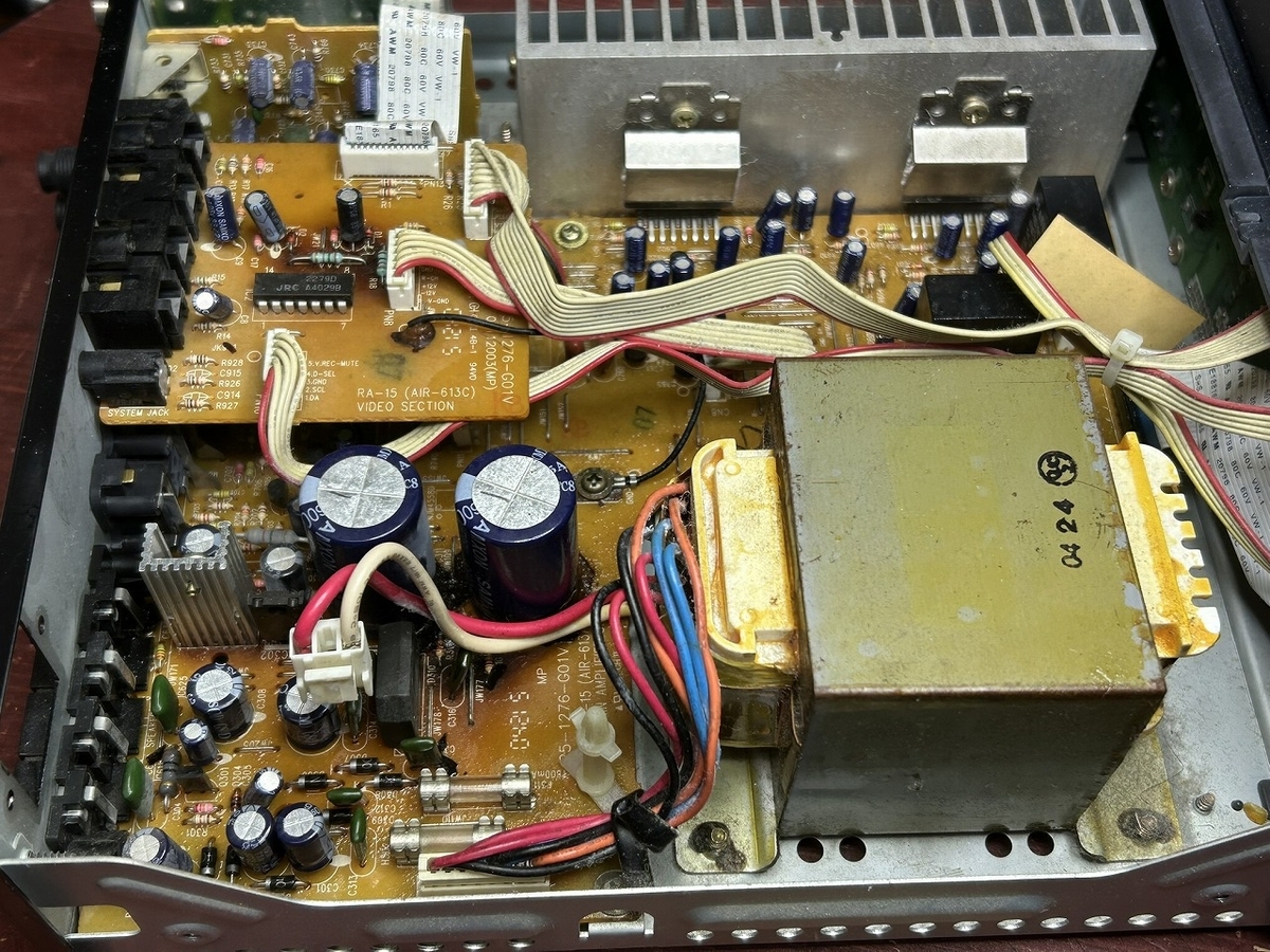 しかし、このレシーバのこれまでの修理の経験から、電源投入回路は電解コンデンサが劣化し、電源が入らなくなるという不具合がありますので、ばらすことにしました。