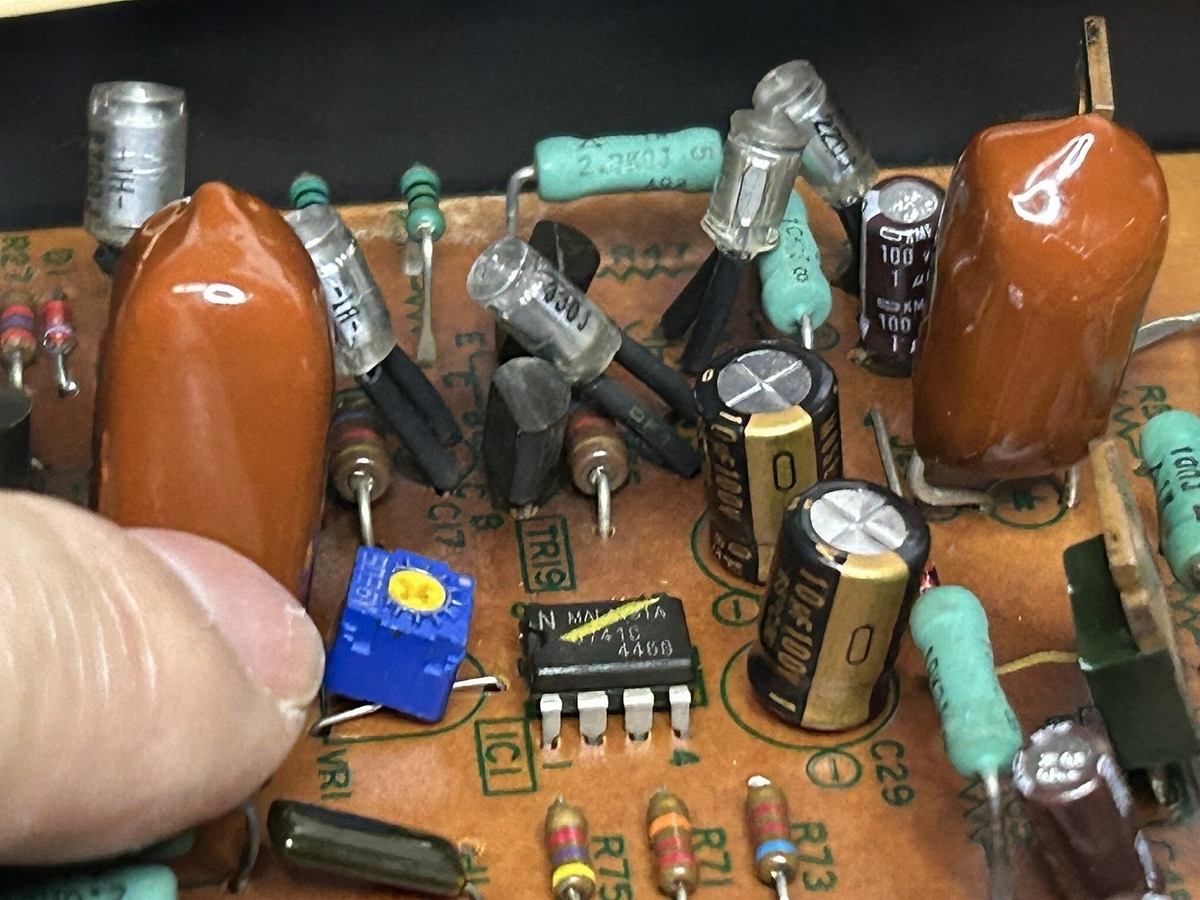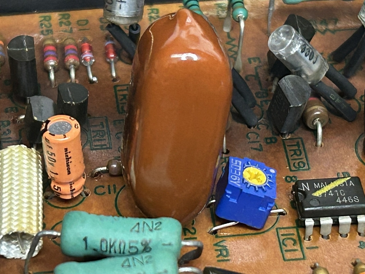 今回の故障の原因は、前使用者が電解コンデンサの周波数特性をよくするために、1μFの大きなフィルムコンデンサをパラレルに取り付けた改造を行ったことが発端です。がたいが大きいので、はんだ面には取り付かず、部品面に大きなコンデンサを取り付け、はんだ面に電解コンデンサを取り付けたようです。