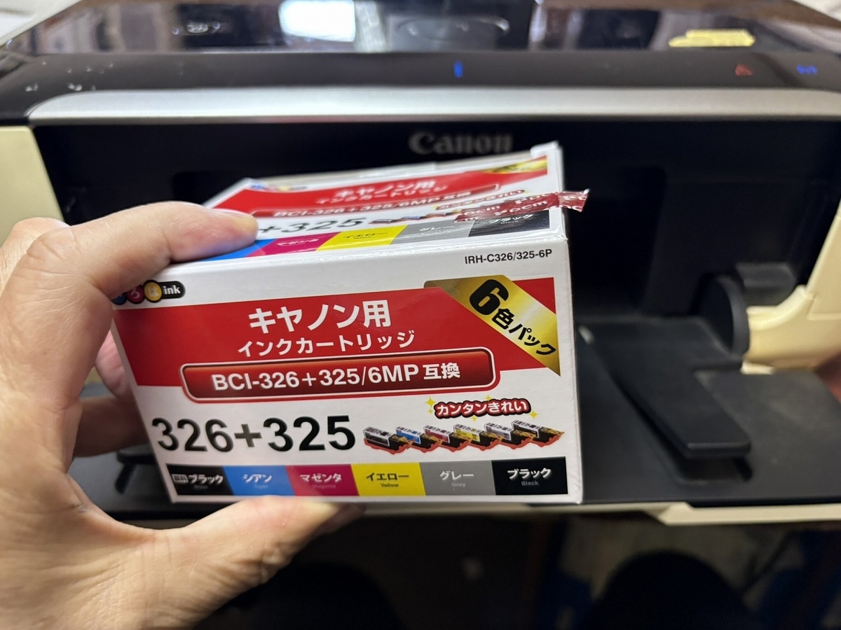 そこで、新しいインクを装着します。新しいインクをホームセンターに購入しに行ったのですが、発売から15年以上経過しているので、純正品はなかなか手に入りません。そればかりか、互換品すら地方のホームセンターにはなかなか無いことが分かりました。隣町のホームセンターでやっと互換品をゲットしました。