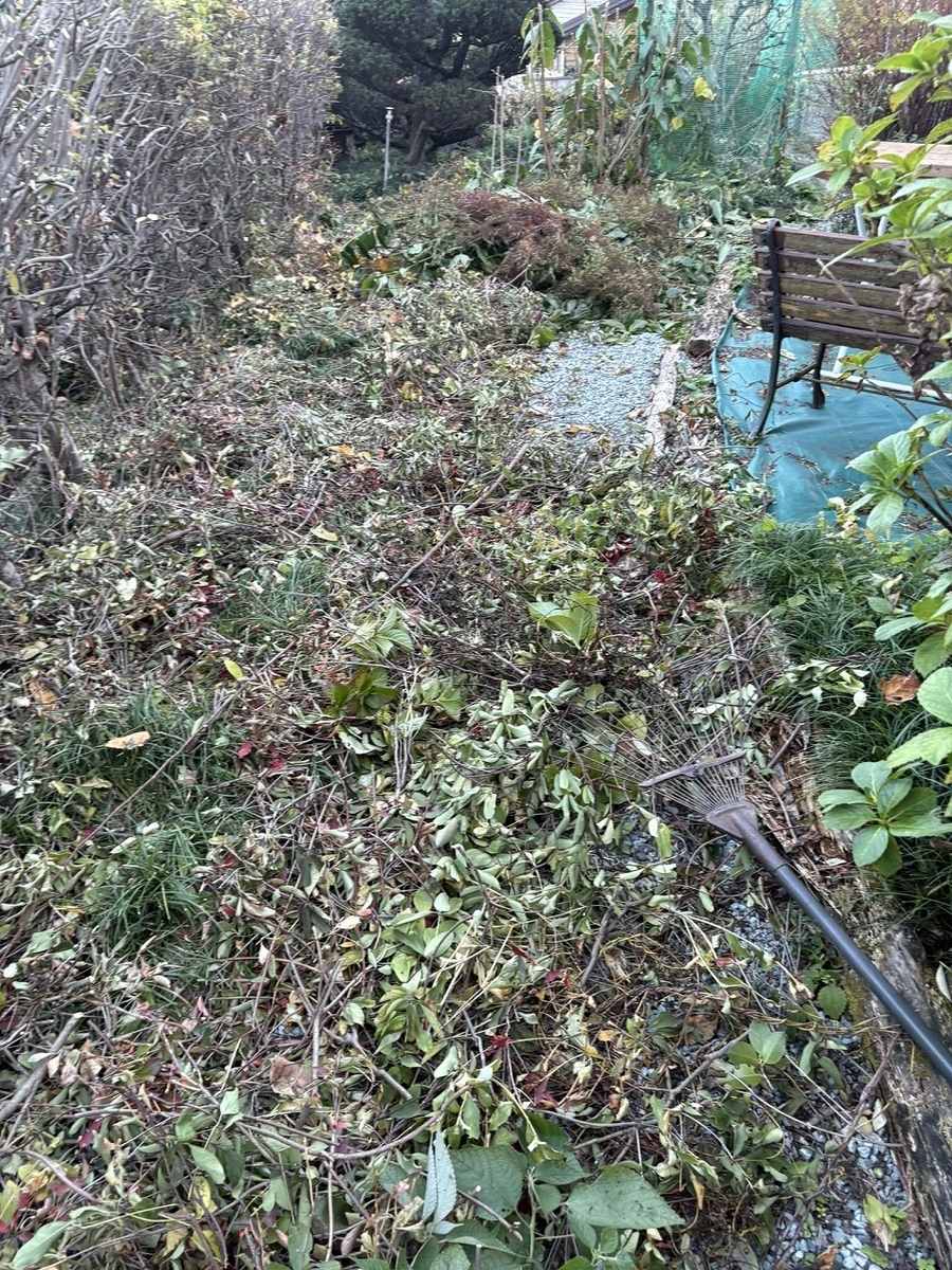 門の近くのドウダンと梅の剪定をして頂いたので、それが掘りにどっさりあります。