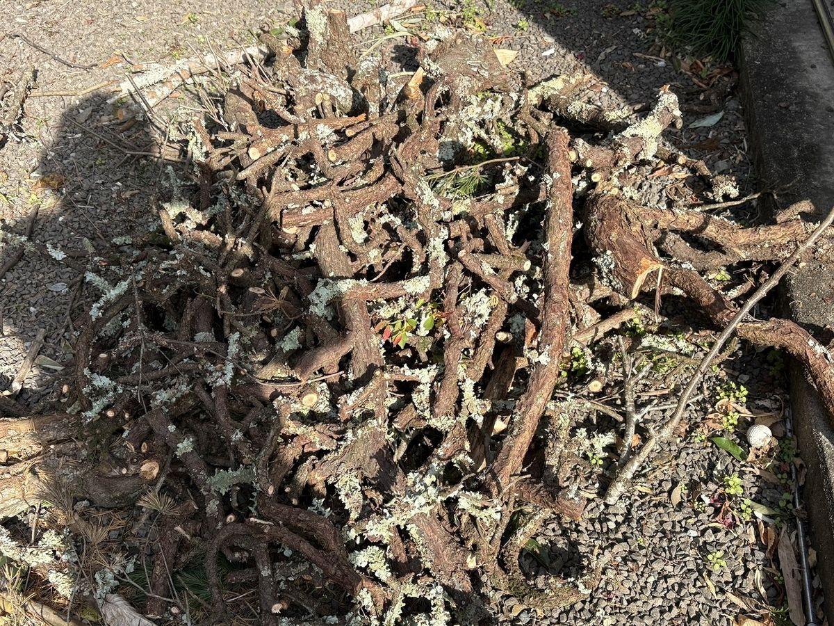 さて、今日の話は昨日の続きで『2年振りの植木の後片付け』で、今回がその2です。今回は門の近くのドウダンとしだれ梅の枝の処理、そして、年老いた松を伐採したので、その枝の後始末です。