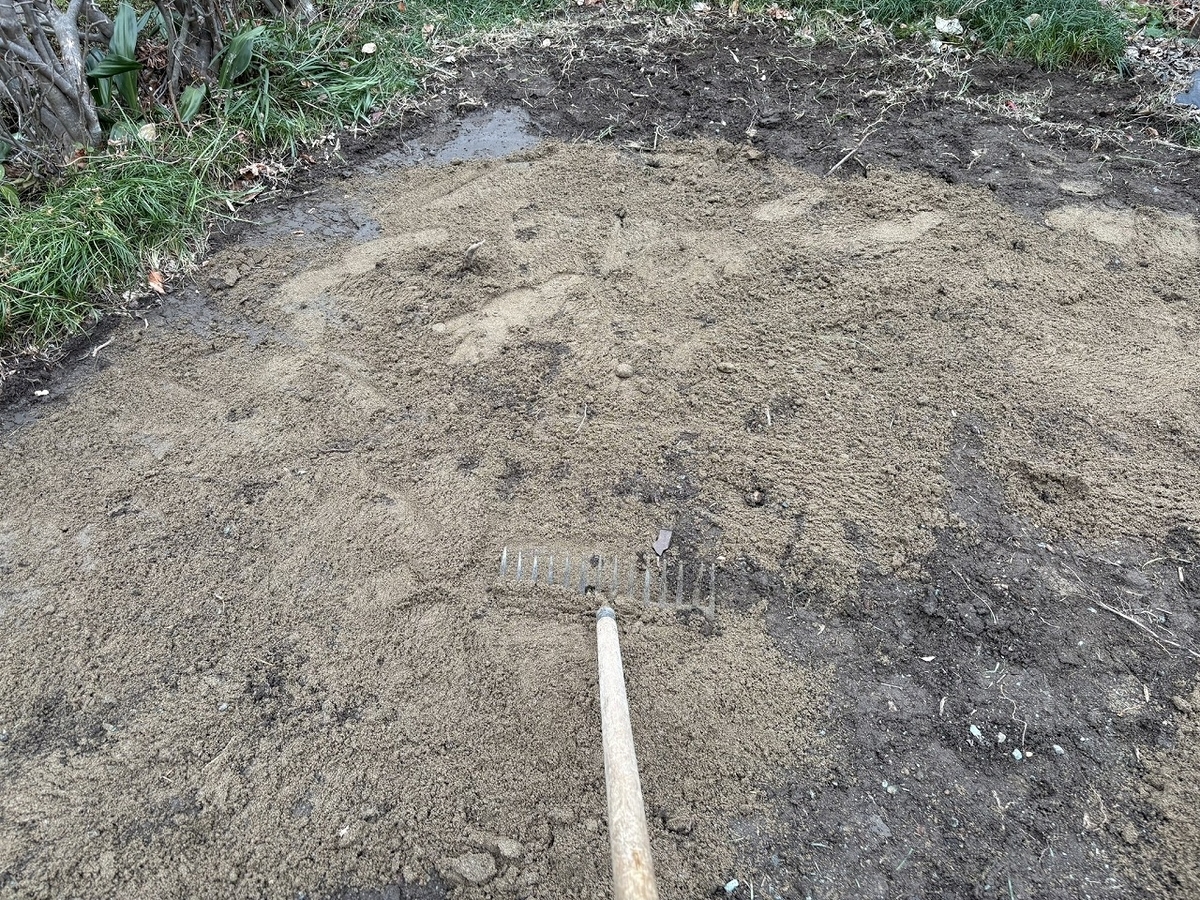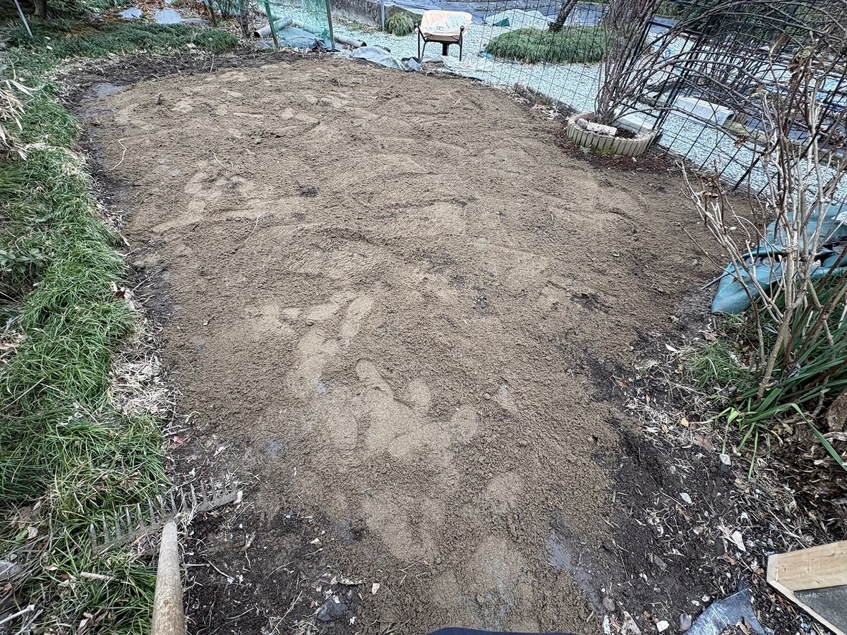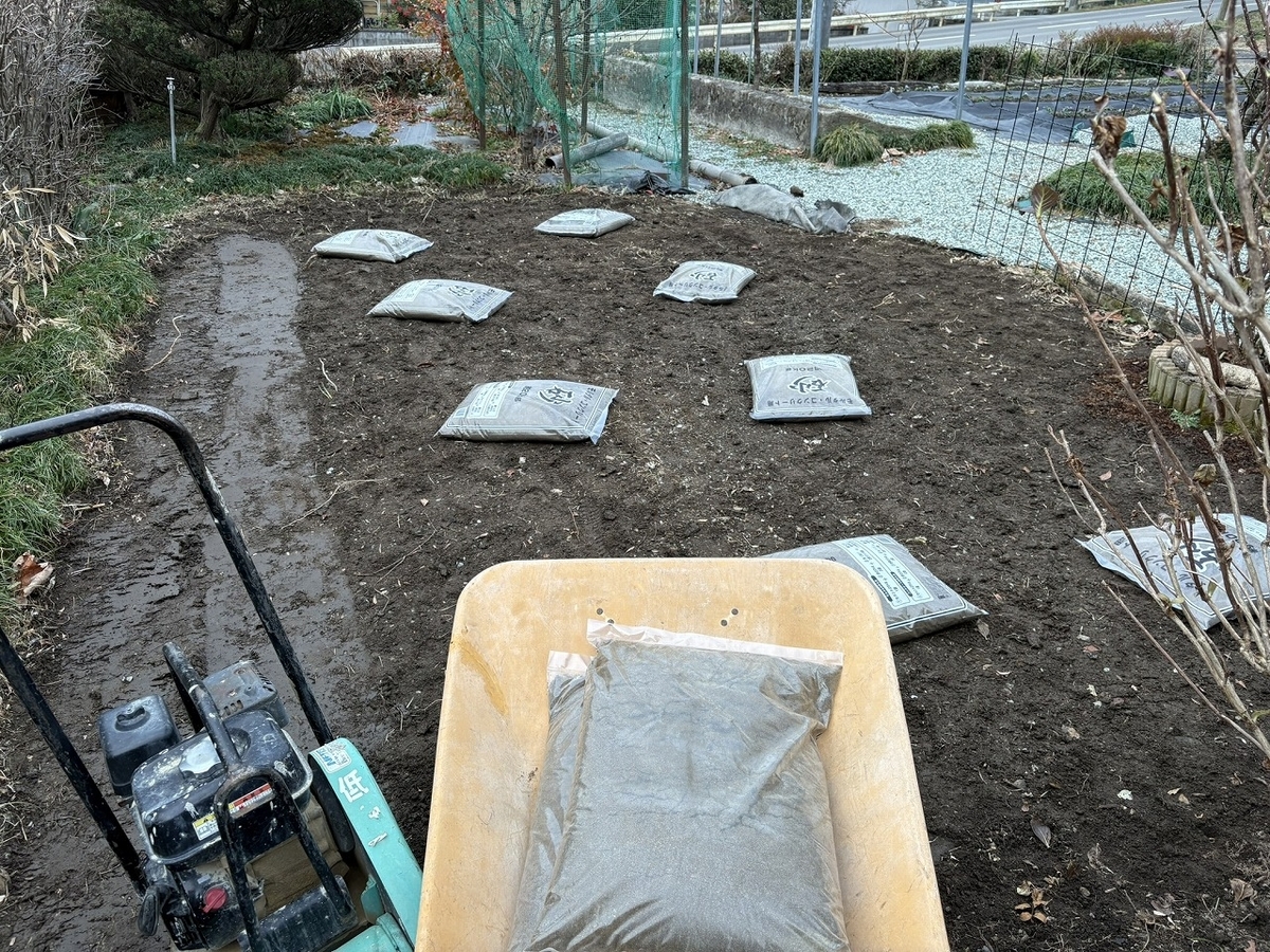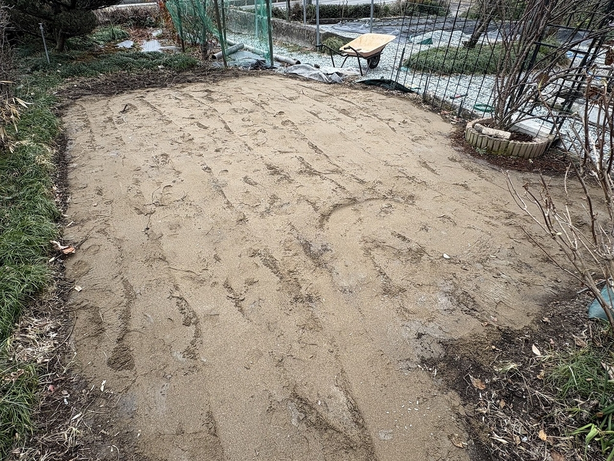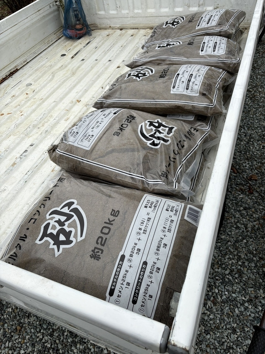 そこで、ホームセンターで砂を10袋購入して、これを表面に敷きます。
