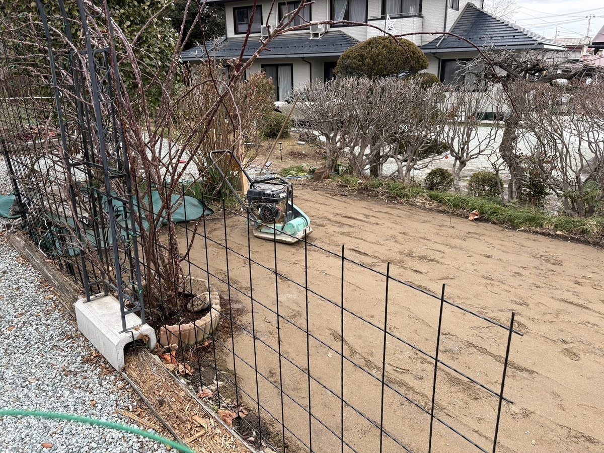 今回はその1で、サークルレンガテラスの土台を整備する話と弦バラの誘引ネットを設置する話です。