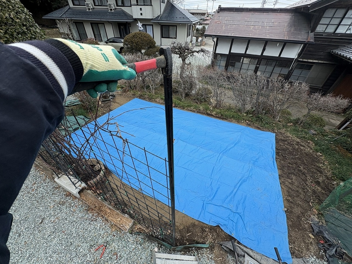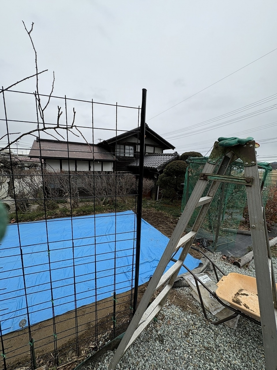 プレートでの地固めが思いのほかスムーズに終了したので、弦バラの誘引ネットを設置することにしました。