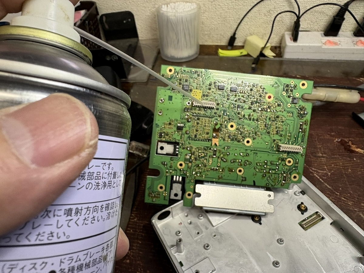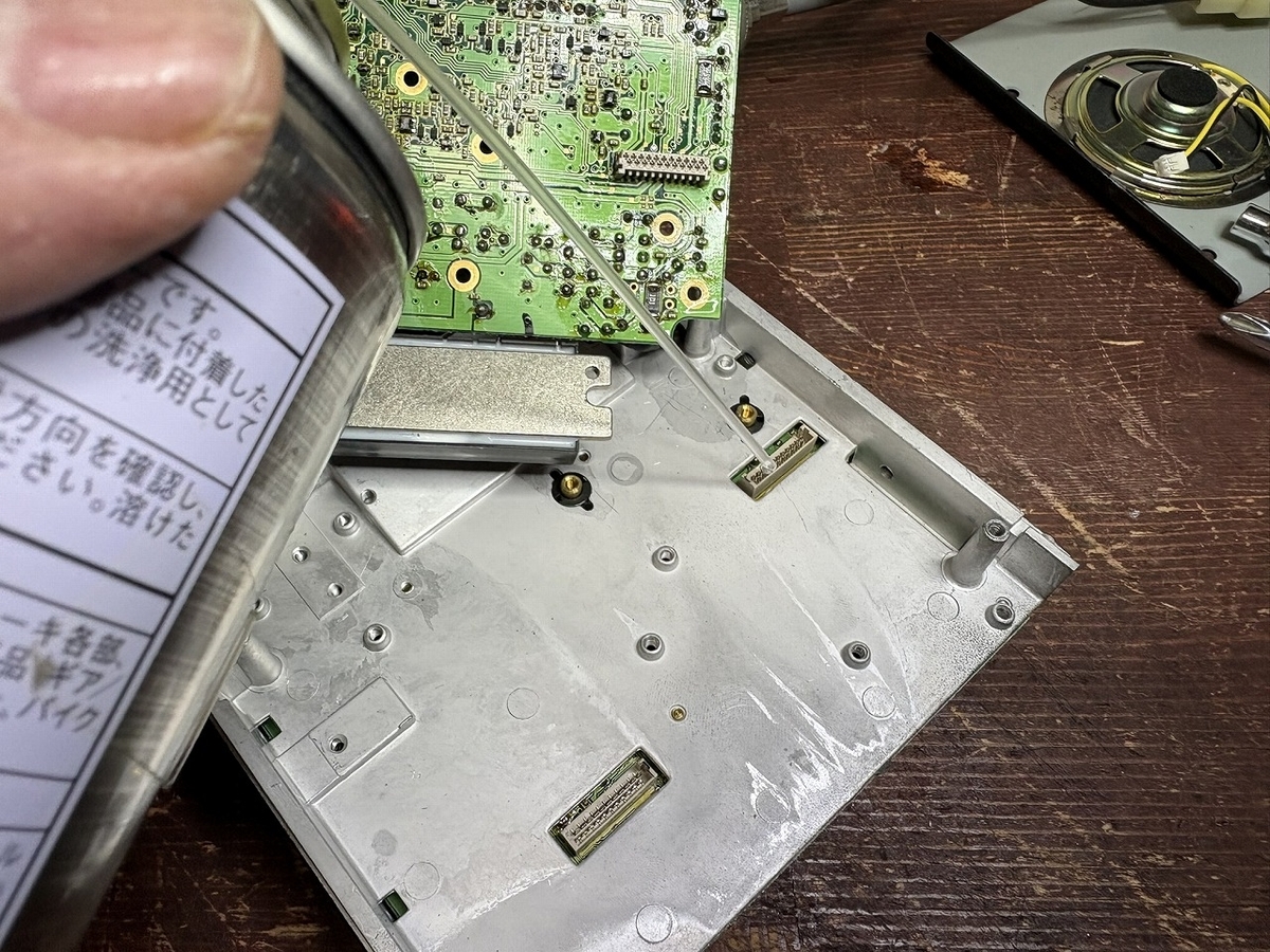それでは基板を組付けますが、この基板は裏側の基板と2つの直付けコネクタで接続されているので、組付け前にこのコネクタの接点を洗浄します。